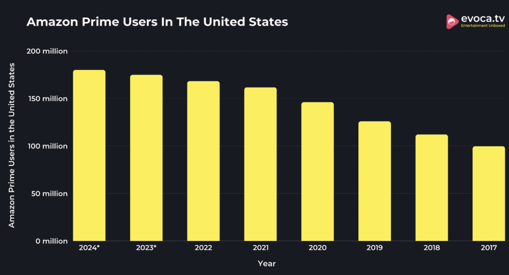 Amazonプライムの加入者数は、2017年から2022年にかけて68.81% 増加しました。2025年現在、Amazonプライムは2億人を超える会員を擁する世界最大のサブスクリプションサービスです。米国では会員数が1億8,010万人に増加し、7,660万世帯がプライムを利用しています。