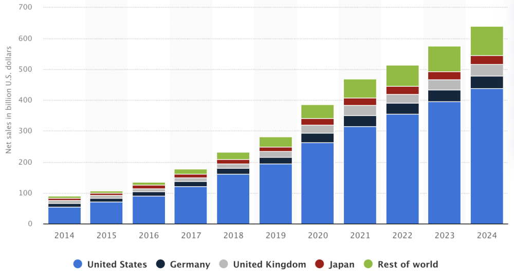 引用:Annual net sales of Amazon in selected leading markets from 2014 to 2024